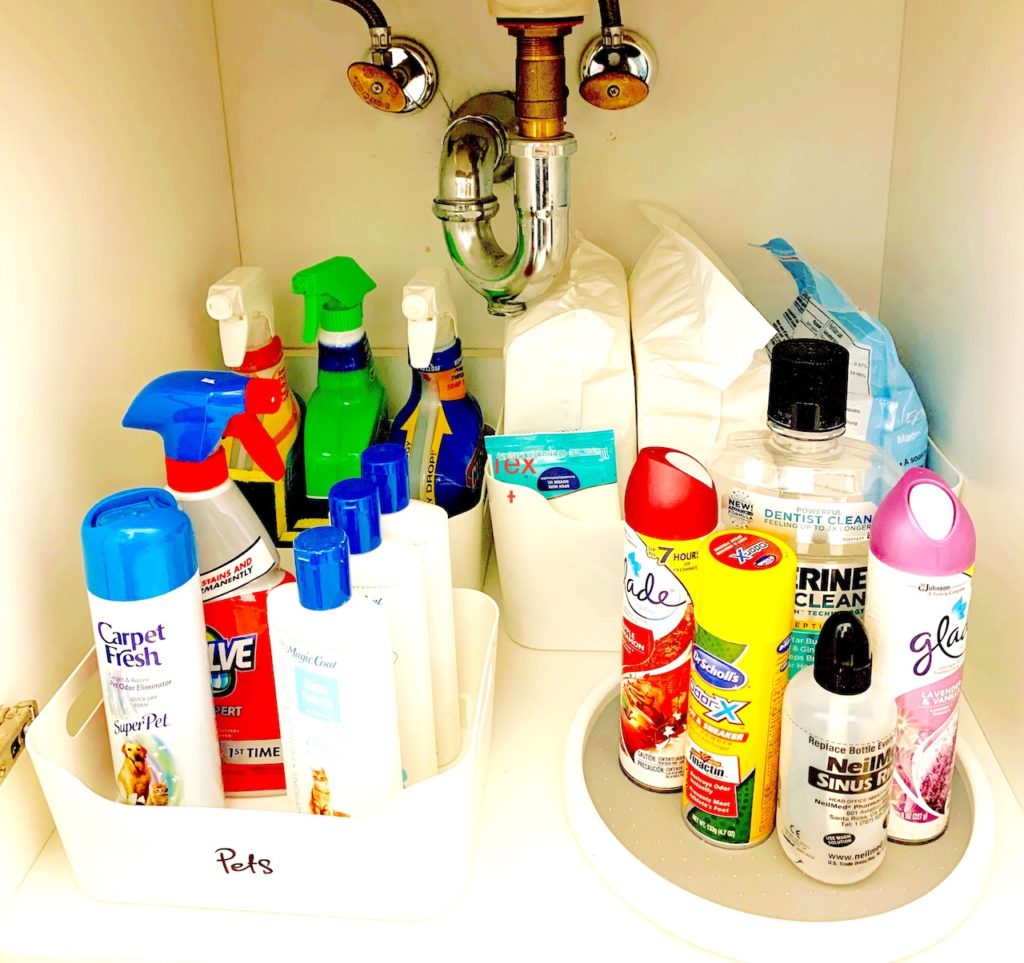 With all that bleach and Lysol that you just purchased to combat the coronavirus let’s make sure we can store our supplies in an easy and assessable space. Take everything out, group similar items and use bins and turntables to organize this area.